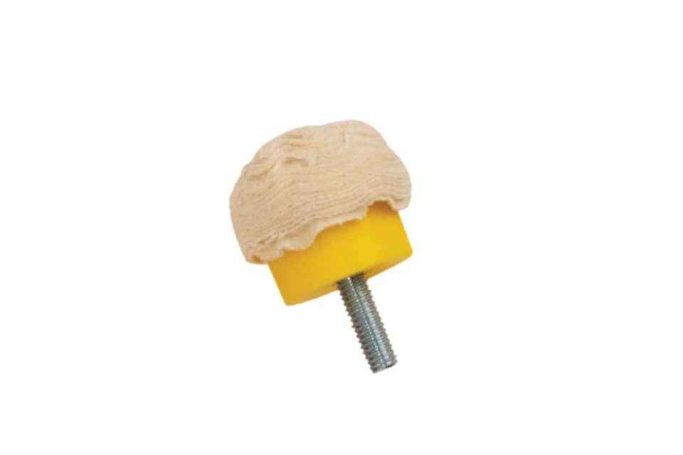 Great for finishing the inside of bowls and goblets. Like the Beall Buffing System there are three types of Bowl Buffs. First is an all linen buff (red base) for tripoli compound (123905) to remove scratches. Second is a linen/flanel buff (white base) for white diamond compound (123906) to remove the remaining tripoli and for final polishing. The third buff is all flannel (yellow base) for applying carnauba wax (123907). Each Bowl Buff has a 3/8″ threaded bolt on the bottom to allow them to be used with the same mounting hub as the Beall Buffing System.Â
