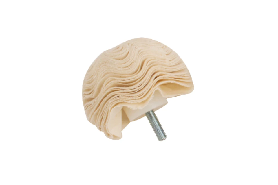 Great for finishing the inside of bowls and goblets. Like the Beall Buffing System there are three types of Bowl Buffs. First is an all linen buff (red base) for tripoli compound (123905) to remove scratches. Second is a linen/flanel buff (white base) for white diamond compound (123906) to remove the remaining tripoli and for final polishing. The third buff is all flannel (yellow base) for applying carnauba wax (123907). Each Bowl Buff has a 3/8″ threaded bolt on the bottom to allow them to be used with the same mounting hub as the Beall Buffing System.Â