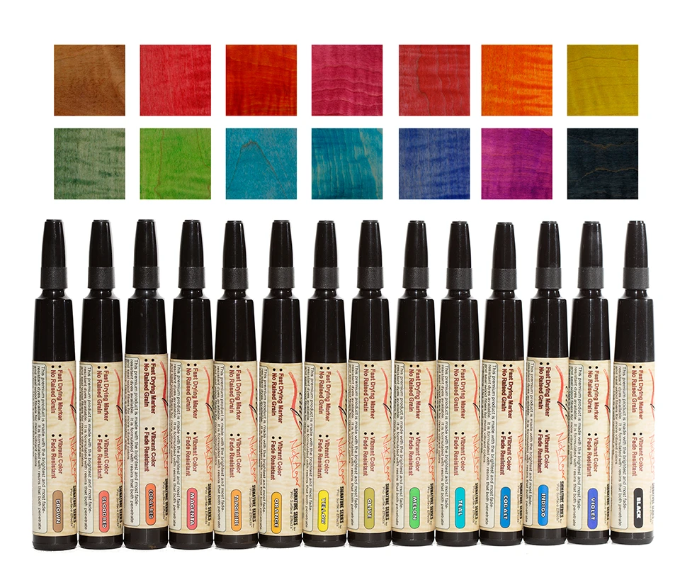 The Nick Agar wood dyes are also available in marker pens that make it convenient to apply to turning projects while on the lathe. Tops, bowls, boxes, and any piece with chatterwork are easily embellished with a wide range of color. The markers have a hard chisel tip that helps to apply the dye where it is needed.