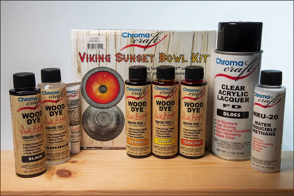 The Nick Agar Viking Sunset Bowl Kit contains everything you need to successfully color and finish a Viking Sunset Bowlâ„¢. It includes Lemon Yellow, Orange, Coral Red, and Black Nick Agar Signature Series Wood Dyes for vivid coloration and a clear sealer for extra protection. The Acrylic FD Gloss Spray provides the high-gloss finish required for the sunset colors. Also included is Nick’s Chroma-Giltâ„¢ Viking Silver which was developed and tested for this application providing the brightest and strongest coverage available. Made by Chroma Craft.