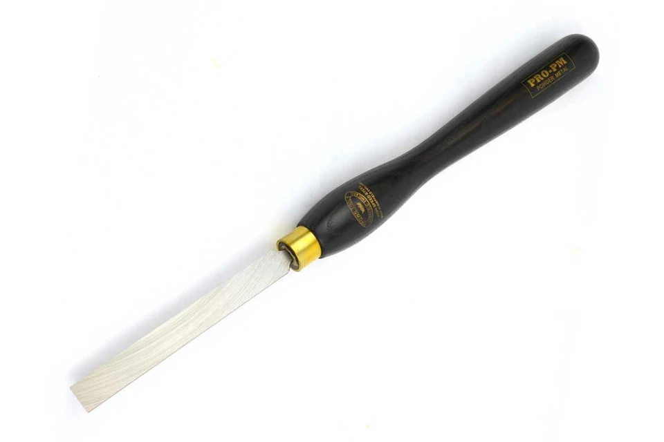 The Pro-PM Tools will grind easily with a regular white aluminum oxide grinding wheel. The bowl turning tools come fitted with 16″ black ash handles while the spindle tools have a 12-1/2″ black ash handle. All handles are fitted with solid brass ferrules. The spindle gouges are sized by the diameter of the steel used while the bowl gouges are