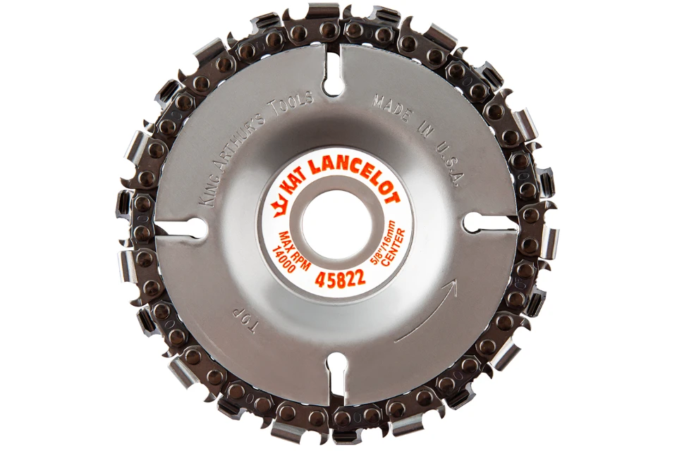 The Lancelot is made of a circle of special chainsaw chain mounted between two stainless steel discs. The chain has consecutive left and right teeth without a skip link, giving twice the number of teeth as a regular chainsaw chain, giving it the ability to power through hardwoods easily. Should the blade hit a nail or piece of wire in wood, on most occasions it will cut through the obstruction. If not, the impact will cause the chain to stop while the discs rotate giving the user a warning to stop the angle grinder. The Lancelot chains are easily sharpened with a 5/32″ (4mm) chain saw file.