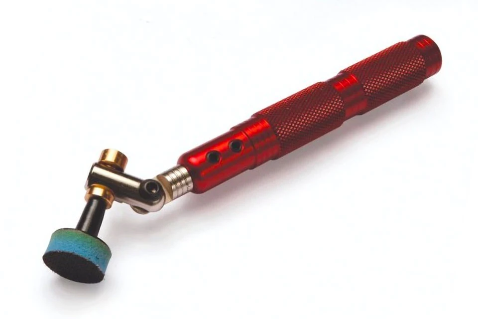This is a scaled down version of Sorby’s popular Sandmaster. It has a 1″ hook and loop rubber disc holder that is set in a bronze bushing. It is powered by the rotation of the workpiece it is placed against. The angle of the holder can be adjusted for versatility. An assortment of 1″ sanding discs is included. Overall length is 9″ with a 5-1/2″ handle.