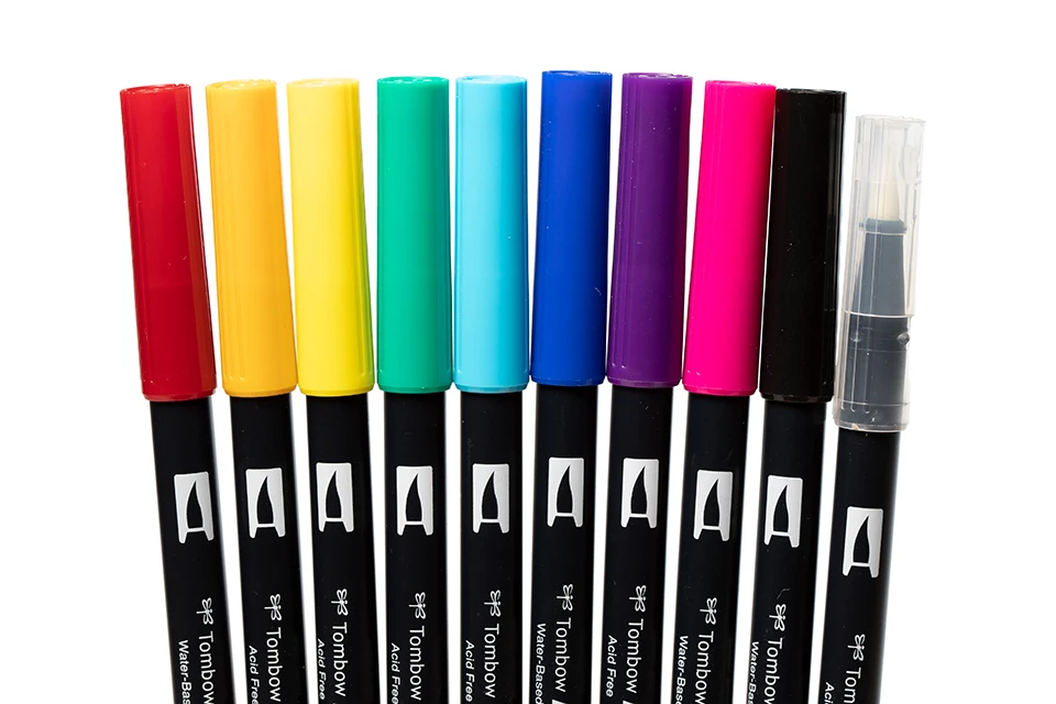 We are happy to be able to offer the same pens as Bonnie Klein uses to color her projects. Each pen has two different tips. On one end is a flexible, brush tip that allows you to change the line width by adding more pressure. The other end has a regular tip for smooth straight lines. These pens are acid free, non-toxic, odorless, water-based, and non bleed. Colors may be blended with the blending pen (12-N00) included in this set. Tombow® is a registered trademark.