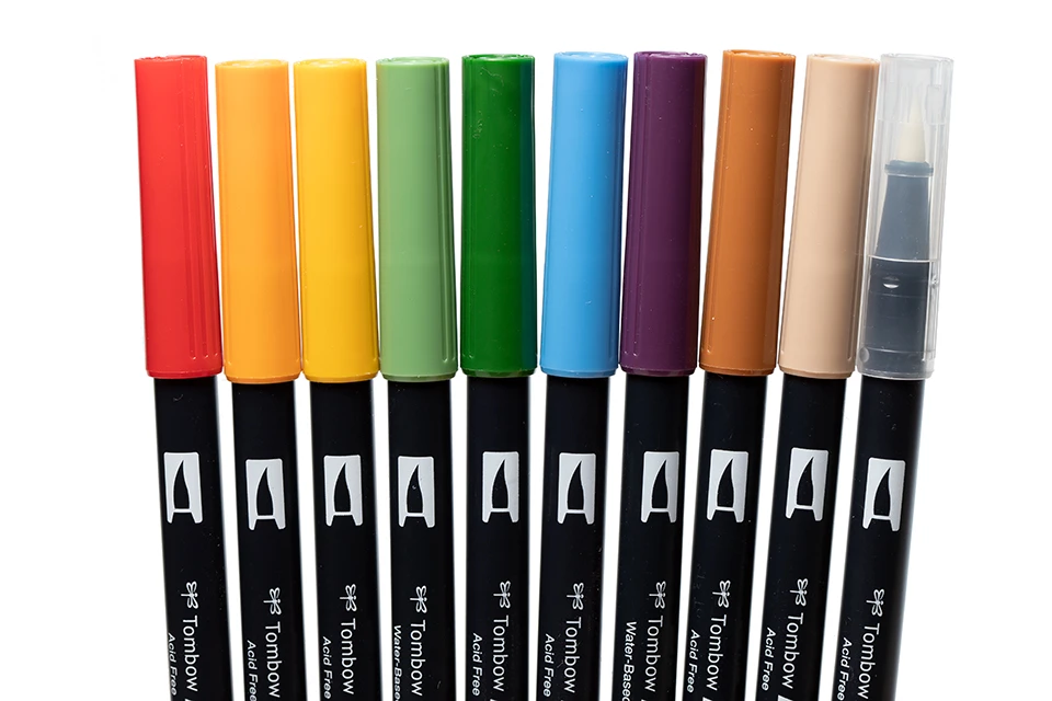 We are happy to be able to offer the same pens as Bonnie Klein uses to color her projects. Each pen has two different tips. On one end is a flexible, brush tip that allows you to change the line width by adding more pressure. The other end has a regular tip for smooth straight lines. These pens are acid free, non-toxic, odorless, water-based, and non bleed. Colors may be blended with the blending pen (12-N00) included in this set. Tombow® is a registered trademark.
